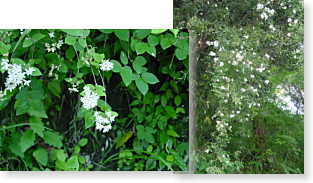 ホタルブクロやノバラが崖から垂れ下がって道路淵も楽しい散歩